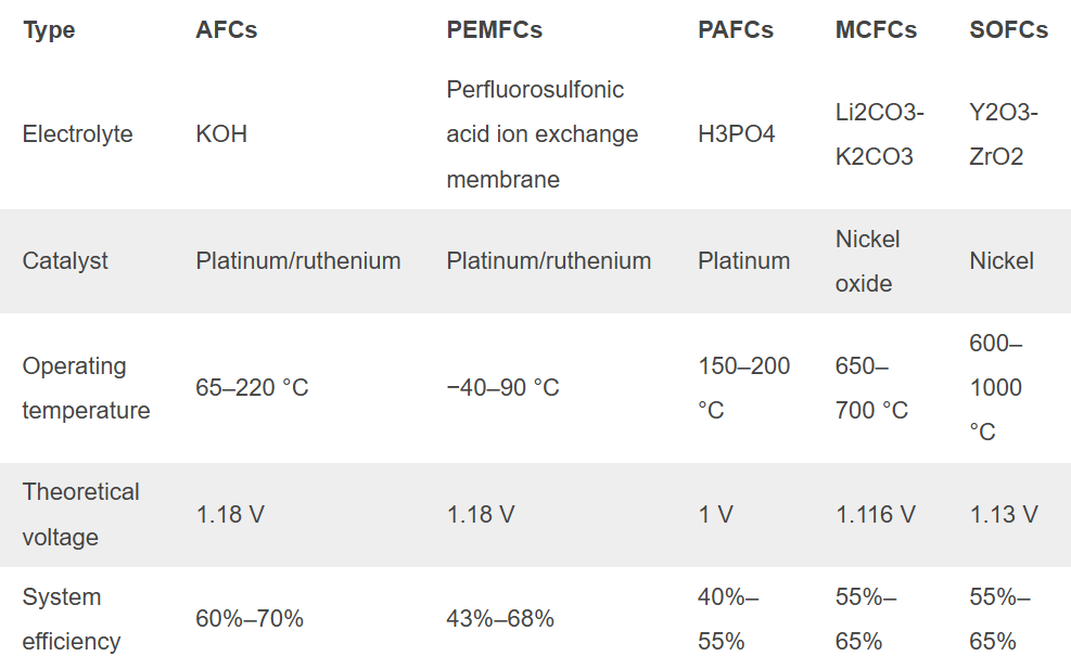 According to the type of electrolyte used, fuel cells can be classified as alkaline fuel cells (AFCs), proton exchange membrane fuel cells (PEMECs), phosphoric acid fuel cells (PAFCs), molten carbonate fuel cells (MCFCs), and solid oxide fuel cells (SOFCs). The classification and characteristics of fuel cells are listed in the following table.