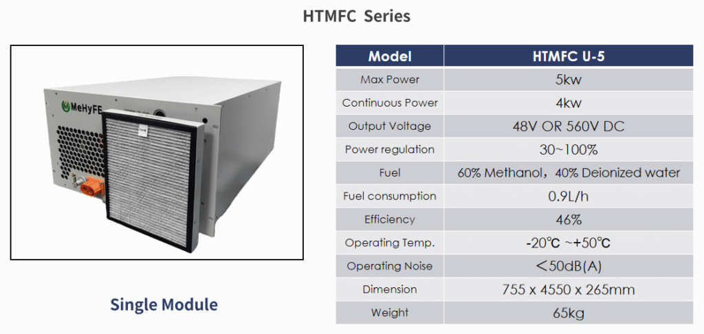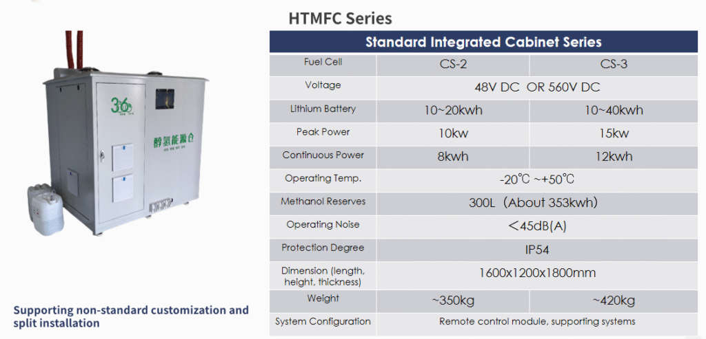 The company also provides an integrated cabinet that integrates the high-temperature methanol fuel cell (HTMFC) unit (single or multiple), lithium battery, methanol barrel, battery management module, and control system in a small control cabinet. Products with a power range of 500W to 20KW can be realized. Customers can apply them to various scenarios according to actual usage needs.